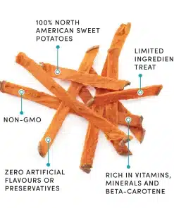 Crumps’ Naturals Sweet Potato Fries are just like the original Sweet Potato Chews but cut into small ‘fries’, perfect for smaller mouths. These pure slices of sweet potato (yam) are slow-baked to become a chewy treat that dogs love! Made from **Human-grade, Ontario grown sweet potatoes**, nothing else is added, making these treats an excellent choice for dogs with sensitivities.