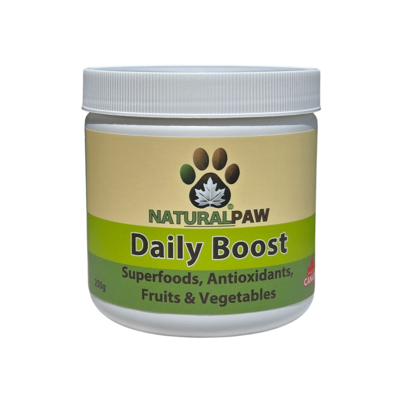 Naturalpaw Daily Boost is a powder supplement that offers a wide variety of Superfoods and Antioxidants from Canadian grown Fruits and Vegetables, plus Green Lipped Mussel, Rooibus Tea Leaf and Diatomaceous Earth. Add nutrition to any type of pet food; raw, cooked, canned or kibble. Commercially prepared pet foods can all use a ‘Boost’ in nutrients.